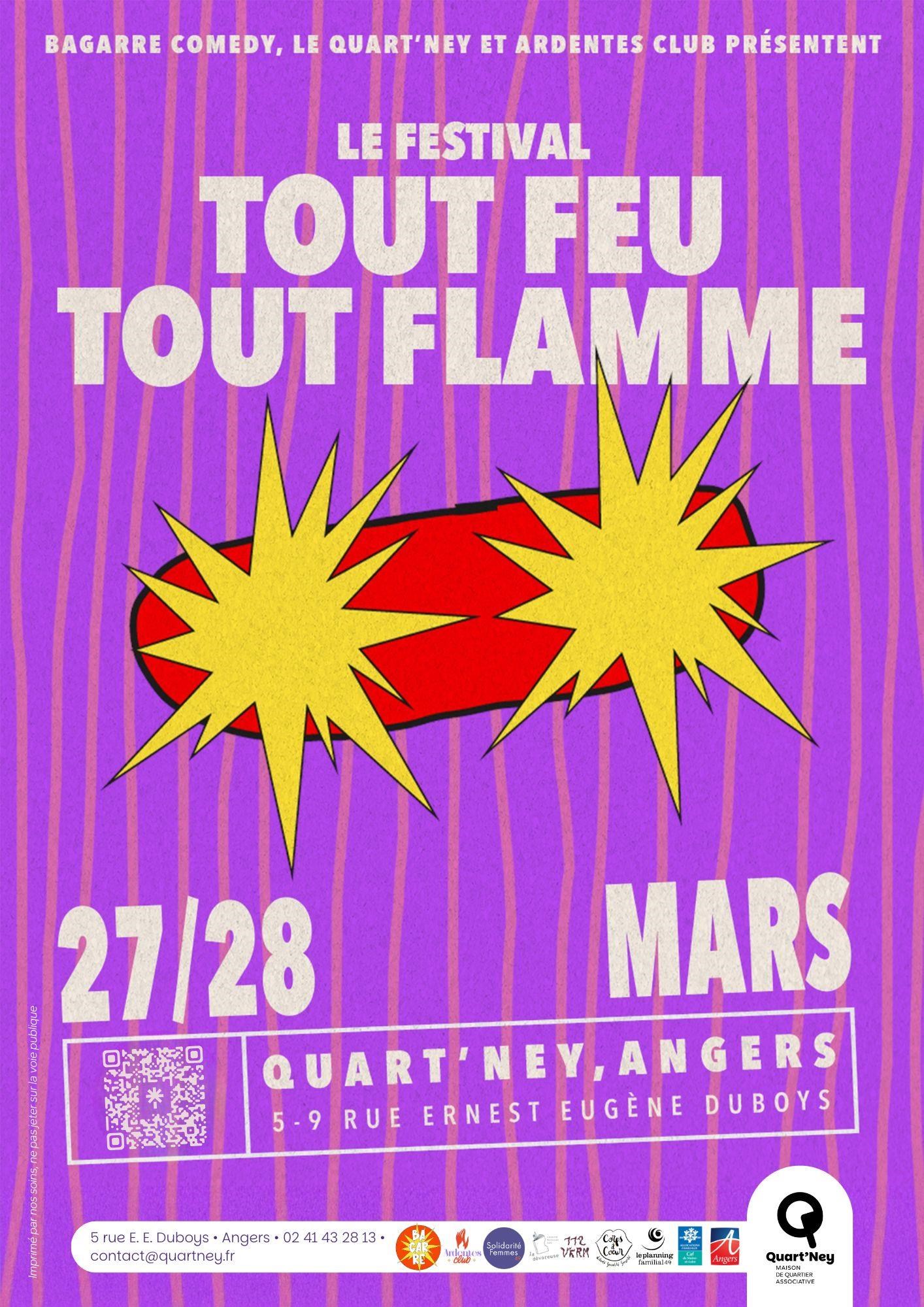 Ce vendredi 27 au samedi 28 mars, la première édition du festival “Tout feu, Tout flamme” embrasera la Maison de quartier angevine le Quart’ney. Elle s’associe avec le Bagarre Comedy et l’association Ardentes Club pour organiser ce festival 100% porté par des femmes et des minorités de genre.